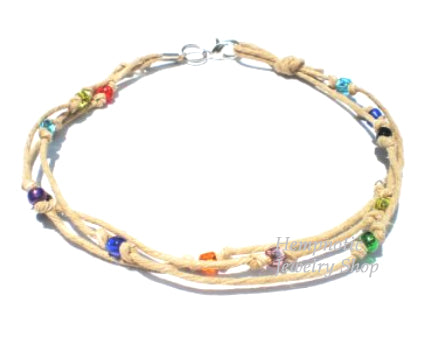 - This gorgeous hemp anklet bracelet is made with beautiful high luster glass beads, Natural hemp cord. For the clasp we use a 7 mm silver plated clasp. All glass beads are a show stopper.